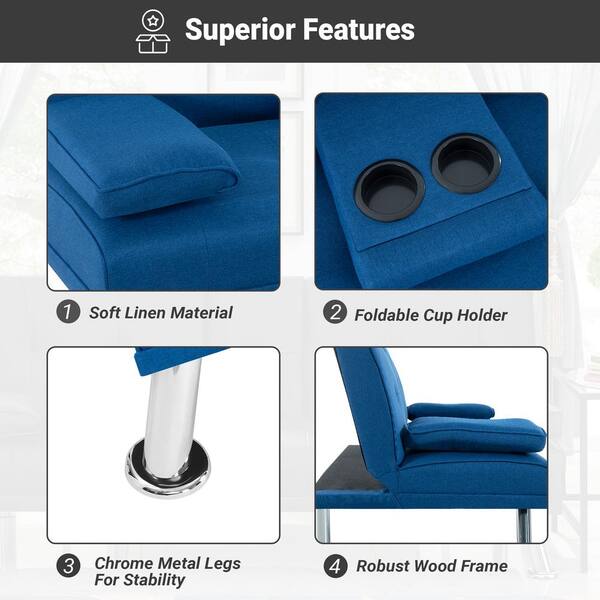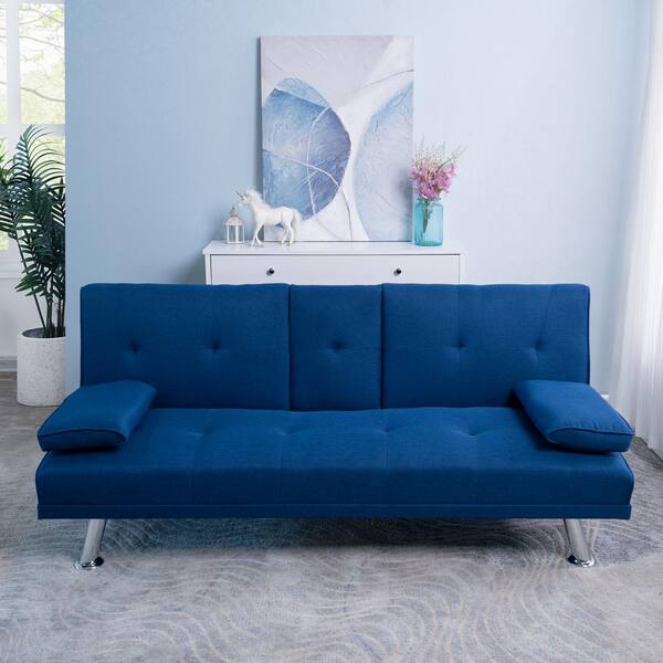 65.75 in. Square Arm Linen Rectangle Convertible Sofa in Blue