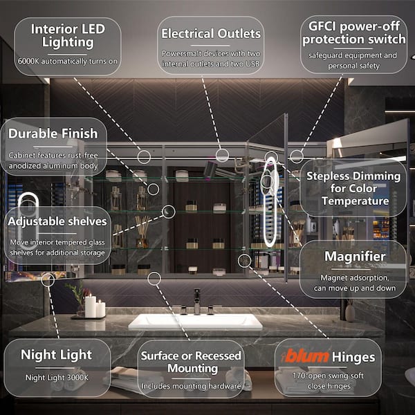 • 5-sided mirror door with 170° Blum hinges for easy access.