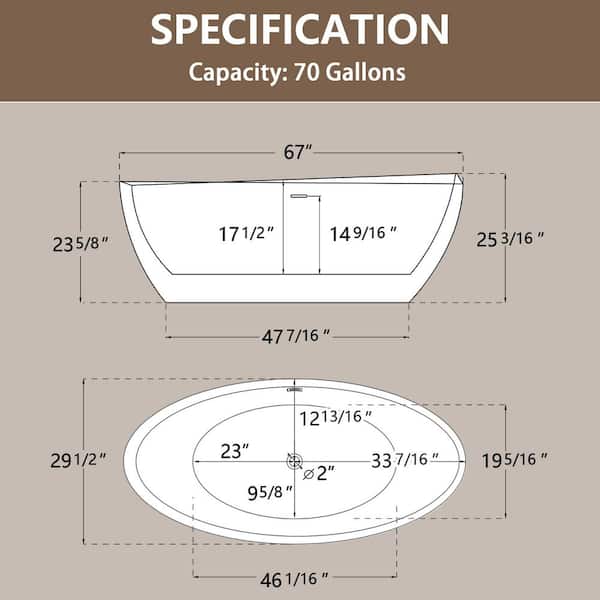 67 in. x 29.5 in. Acrylic Freestanding Soaking Bathtub Flatbottom Oval Tub with Center Drain Free Standing Tub in White