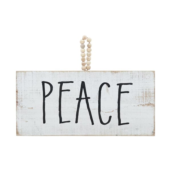 7.125 in. Peace White Wood Christmas Wall Sign with Natural Wood Bead String