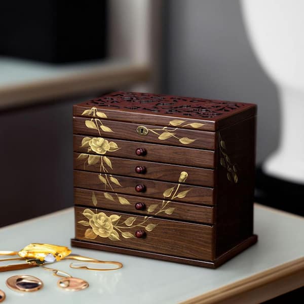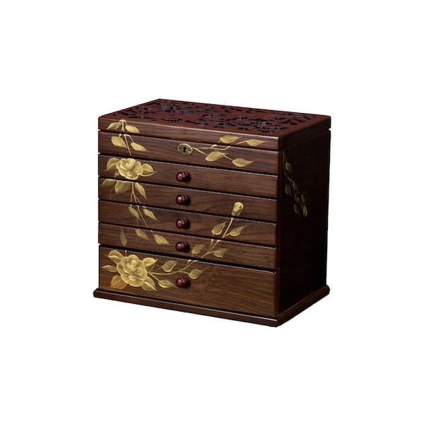 7 Layer Brown Rectangular Wood Jewelry Box with Hand Painted Roses