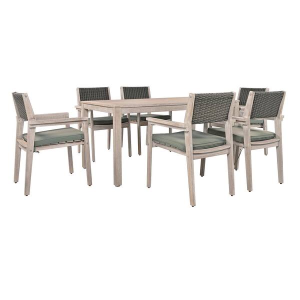 7-Piece Acacia Wood Outdoor Dining Set with Rattan Backrest and Removable Cushions for Patio and Backyard, White Washed