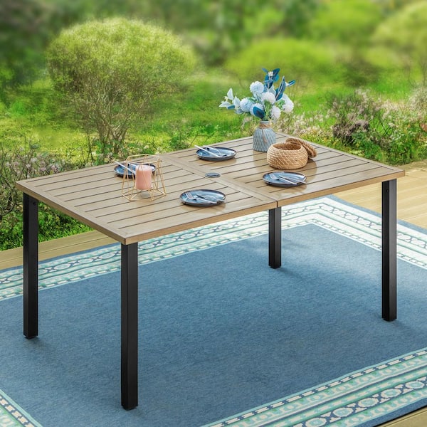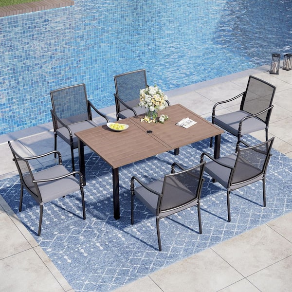 7-Piece Black Metal Patio Outdoor Dining Set with Wood-Look Rectangle Table and Gourd Design Chairs with Gray Cushions