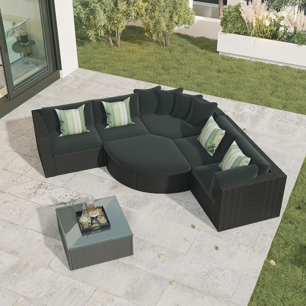 7-Piece Black Wicker Outdoor Patio Conversation Set with Gray Cushions and Pillows