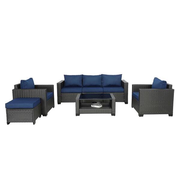 7-Piece Black Wicker Patio Outdoor Sofa Loveseat Conversation Seating Set with Dark Blue Cushions and Sloped Back