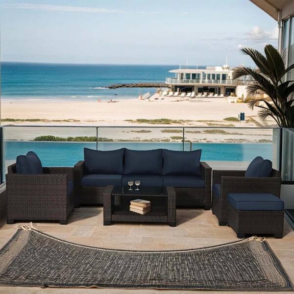 7-Piece Brown Handwoven Rattan Wicker Outdoor Patio Sectional Sofa Set with Dark Blue Cushions and Pillows