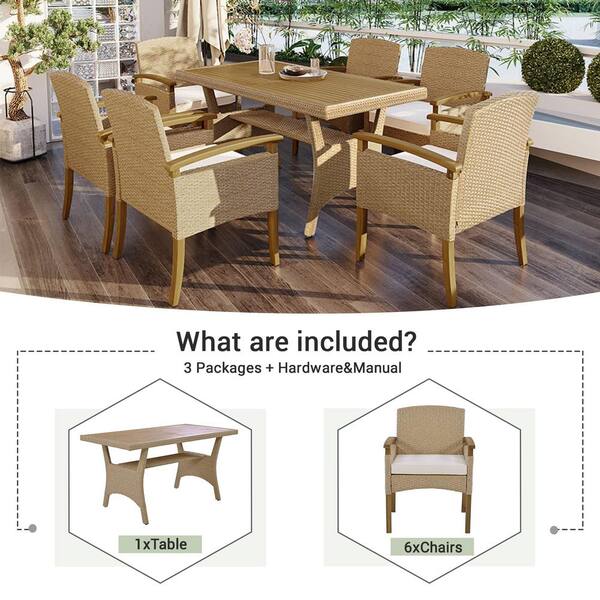 7-Piece Brown Metal All Weather PE Rattan Outdoor Dining Table Set with Wood Tabletop and White Cushions, Seating 6