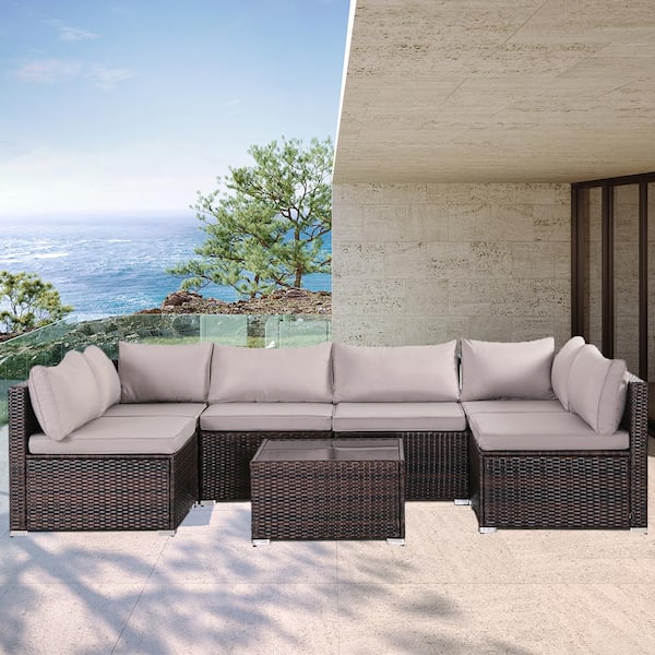 7-Piece Brown Wicker Outdoor Sectional Set, Rattan Outdoor Patio Set with Gray Cushions and Coffee Table