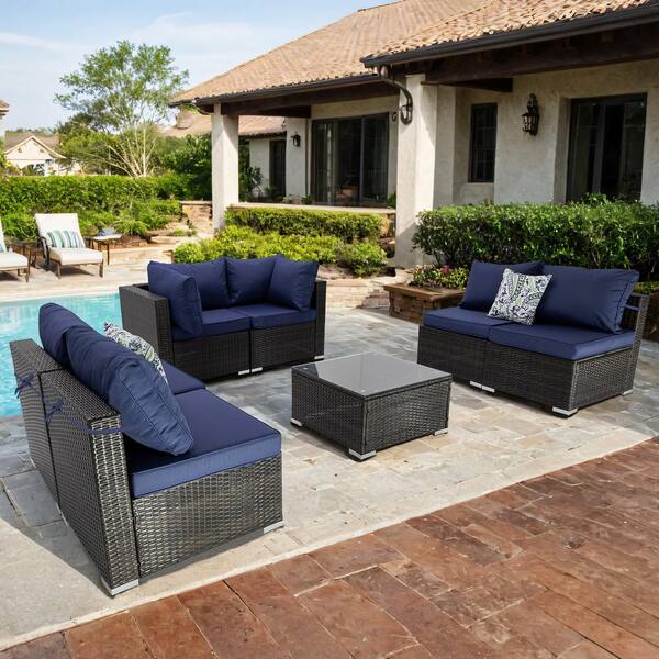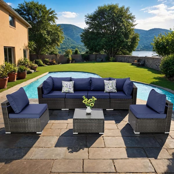 7-Piece Brown Wicker Outdoor Sectional Set with Coffee Table and Dark Blue Cushions