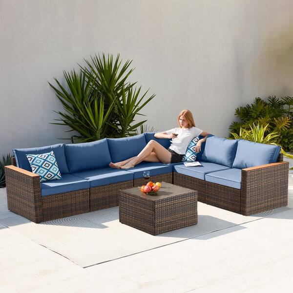 7-Piece Brown Wicker Patio Outdoor Sectional Sofa Set with Blue Cushions for Backyard, Lawn, Outside