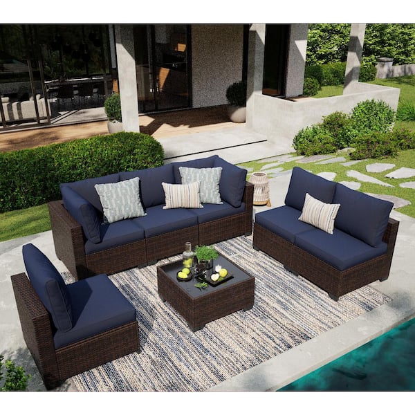 7-Piece Dark-Brwon PE Wicker All Weather Patio Conversation Set with Deep-Blue Cushions