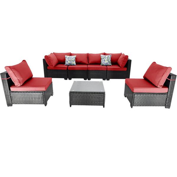 7-Piece Deep Coffee Wicker Outdoor Sectional, Rattan Outdoor Patio Set with Red Cushions, Pillows and Coffee Table