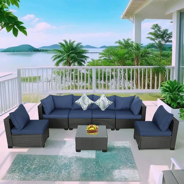 7-Piece Espresso Metal Outdoor Sectional Set Straight Back Sofa Set with Pillows and Dark Blue Cushions for Patio