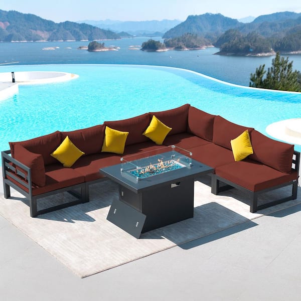 7-Piece Gray Aluminum Outdoor Conversation Set Deep Seating Patio Furniture with Fire Pit Table and Red Cushions