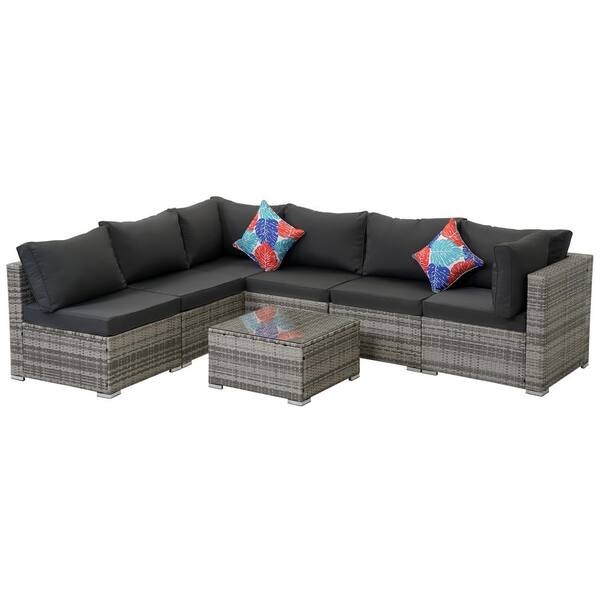 7-Piece Gray Wicker Outdoor Furniture Sectional Sofa with Dark Gray Cushion and Coffee Table