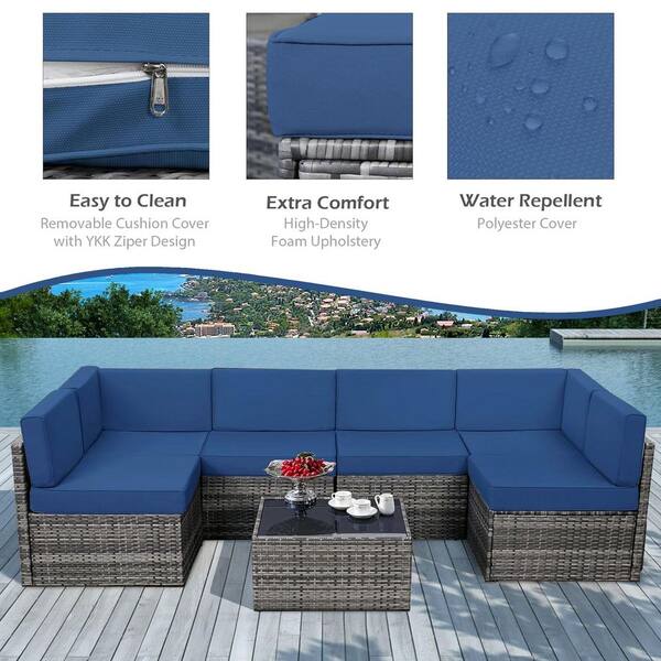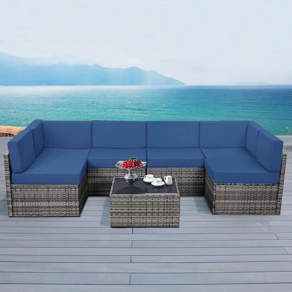 7-Piece Gray Wicker Outdoor Sofa Sectional Set Patio Seating Sets with Dark Blue Cushions