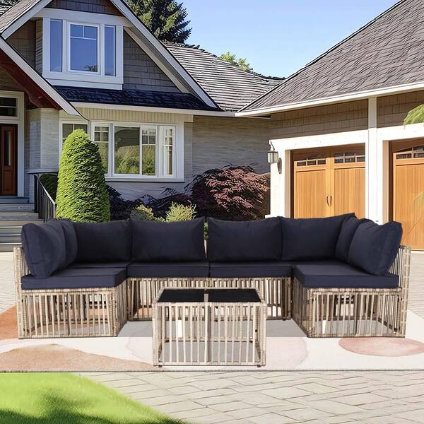 7-Piece Gray Wide Wicker Outdoor Patio Conversation Sectional Seating Set with Coffee Table and Blue Cushions