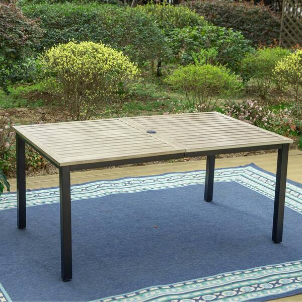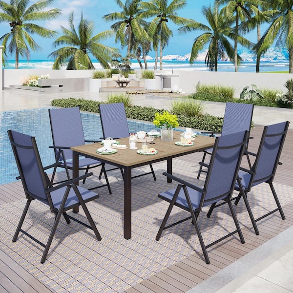 7-Piece Metal Outdoor Dining Set with Brown Rectangular Table-Top and Blue Folding Chairs
