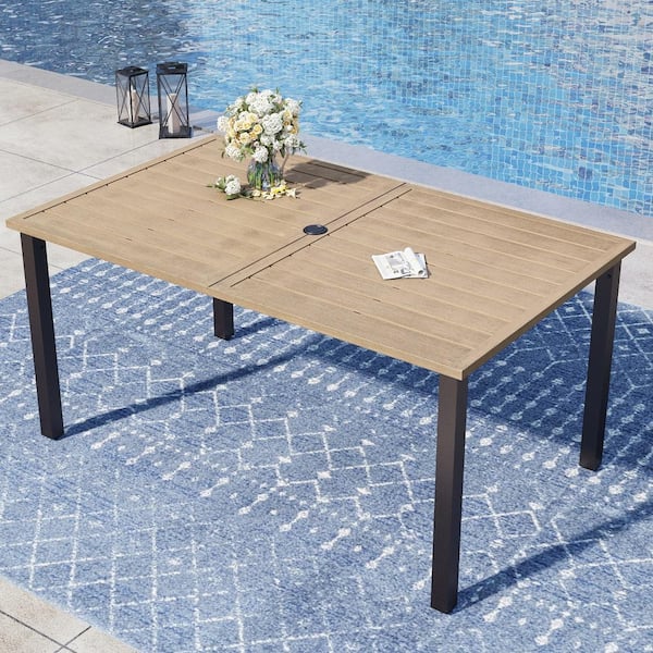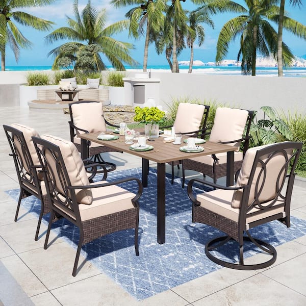 7-Piece Metal Patio Outdoor Dining Set with Brown Rectangle Table and Chairs with Beige Cushions