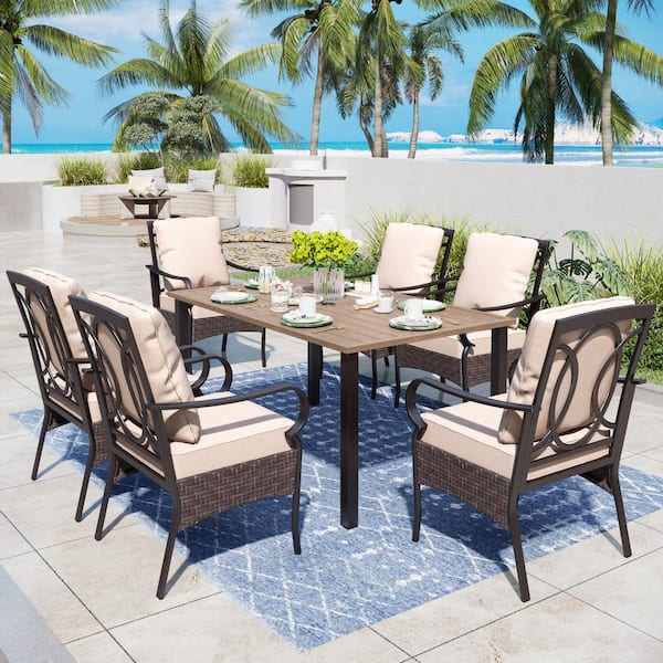 7-Piece Metal Patio Outdoor Dining Set with Brown Rectangle Table and Chairs with Beige Cushions