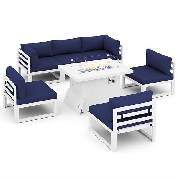 7-Piece White Aluminum Outdoor Conversation Set Deep Seating Patio Furniture with Fire Pit Table and Navy Blue Cushions