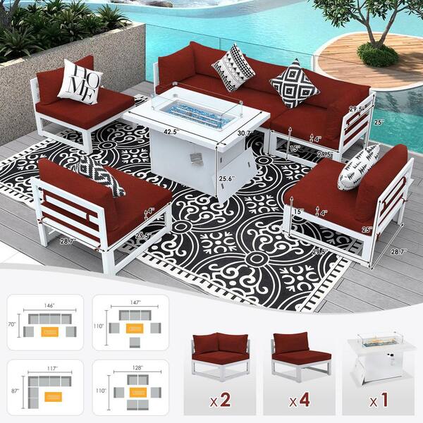 7-Piece White Aluminum Outdoor Conversation Set Deep Seating Patio Furniture with Fire Pit Table and Red Cushions