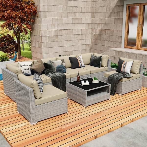 7-Piece Wicker Outdoor Patio Conversation Seating Sofa Set with Coffee Table, Beige Cushions