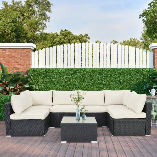 7-Piece Wicker Outdoor Sectional Set Woven Rattan Sofa Set with Beige Cushions
