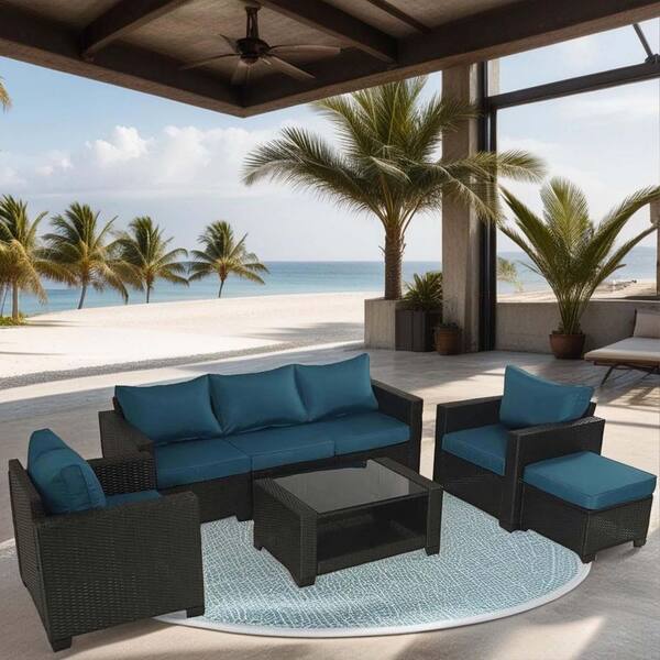 7-Piece Wicker Outdoor Sectional Set with Peacock Blue Cushions and Coffee Table for Balcony Lawn and Garden