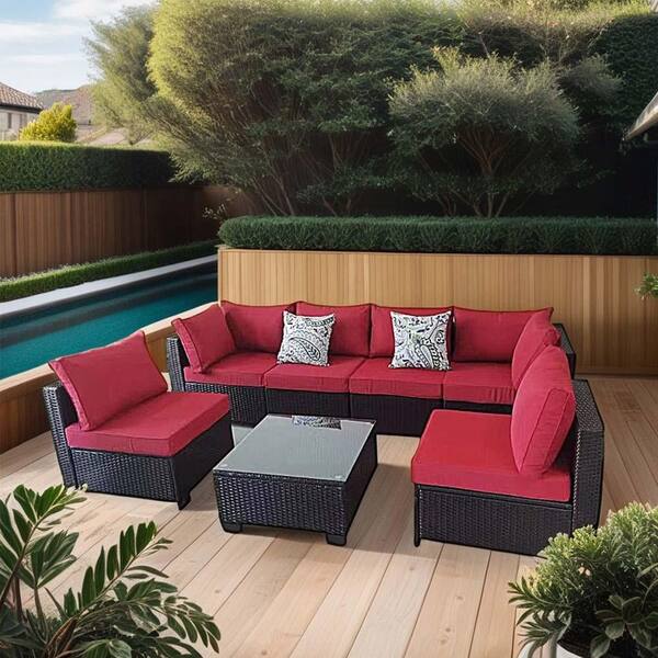 7-Piece Wicker Outdoor Sectional Sofa, Dark Coffee Patio Conversation Set with Coffee Table and Red Cushions