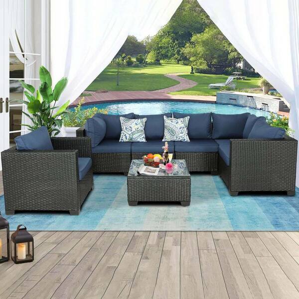 7-Piece Wicker Patio Conversation Set with Blue Cushions, Outdoor Wicker Conversation Couch Sectional Chair Sofa Set