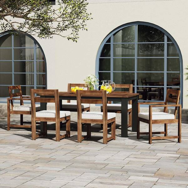 7 Piece Wood Outdoor Dining Set with Beige Cushion and Umbrella Hole, Patio Dining Furniture Set For Porch, Yard, Mocha