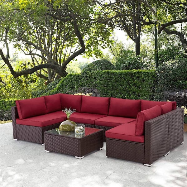 7 Pieces Burgundy Wicker Outdoor Sectional Sofa Hand-Woven Wicker Patio Conversation Set with Coffee Table, Cushions
