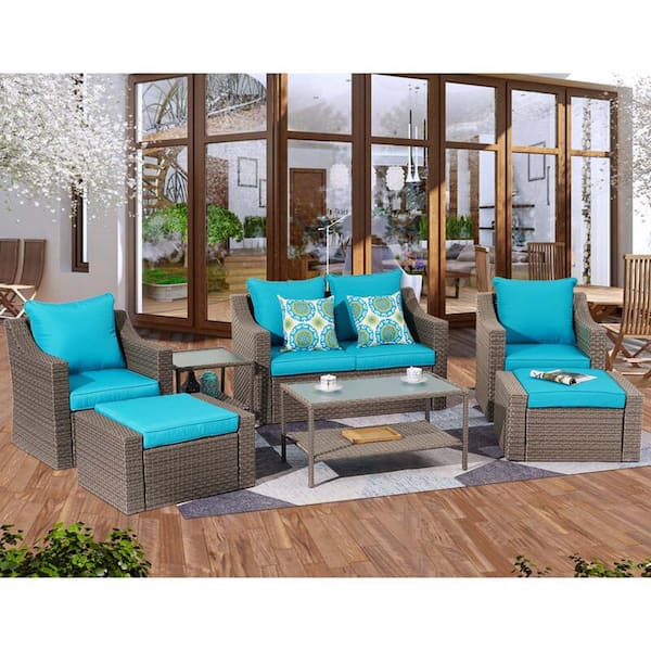 7 Pieces Outdoor Black PE Wicker Patio Conversation Sets with 10-Piece Blue Washable Cushion and Tempered Glass Table