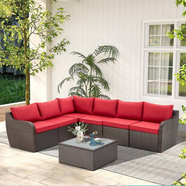 7-Pieces Wicker Outdoor Sectional Sofa Set 6-Person Seating Group with Red Cushions