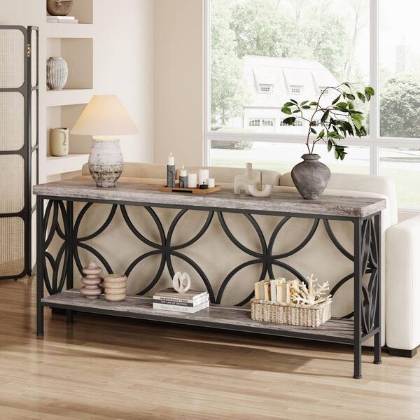 70.9 in. Light Gray Rectangle Engineered Wood Sofa Console Table with 2-Tier Storage Shelf for Entryway