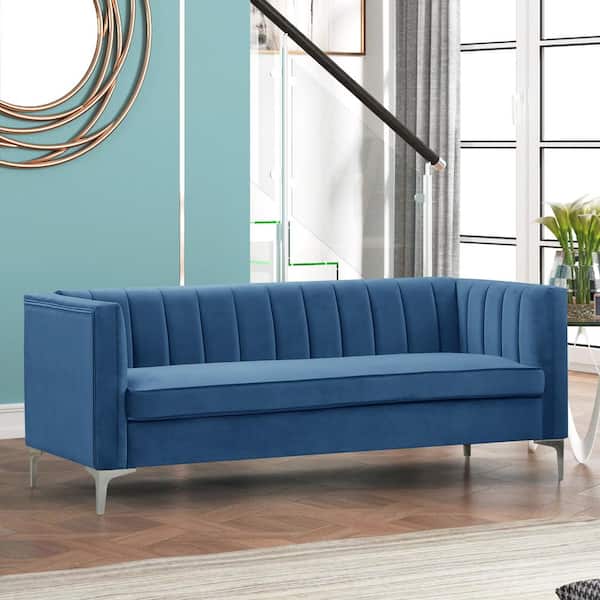 71 in. Wide Square Arm Velvet Mid-Century Rectangle Sofa with Channel Tufted 3-Seater Couch in Blue