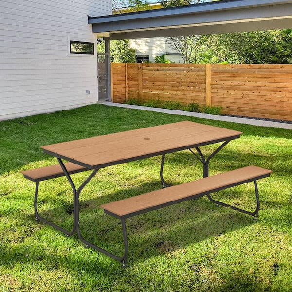 72 in. Brown Rectangle HDPE and Metal Picnic Tables for 6-People to 8-People with 2.3 in. Umbrella Hole