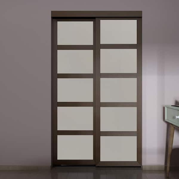 72 in. x 80.5 in. 5-Lite Indoor Studio MDF Wood Mocha Frame with Frosted Glass Interior Sliding Closet Door