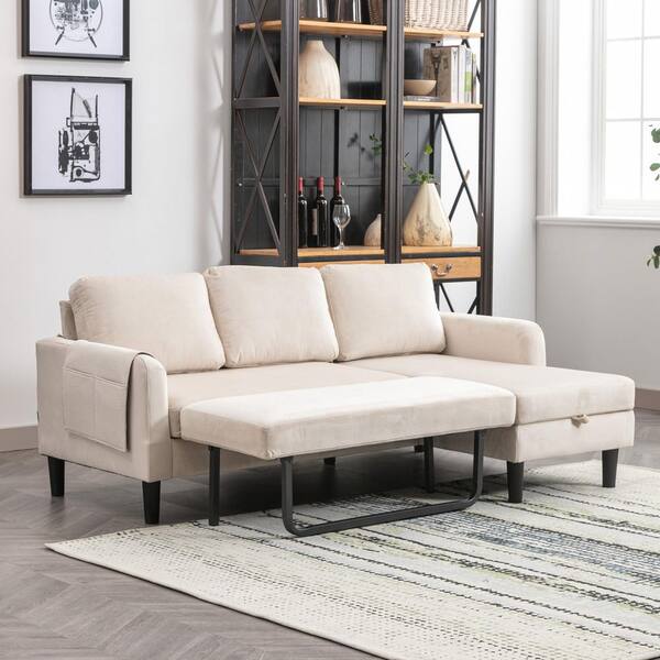 73 in. Modern Ivory Velvet Reversible Sleeper Sectional Sofa Bed with Side Pocket and Storage Chaise