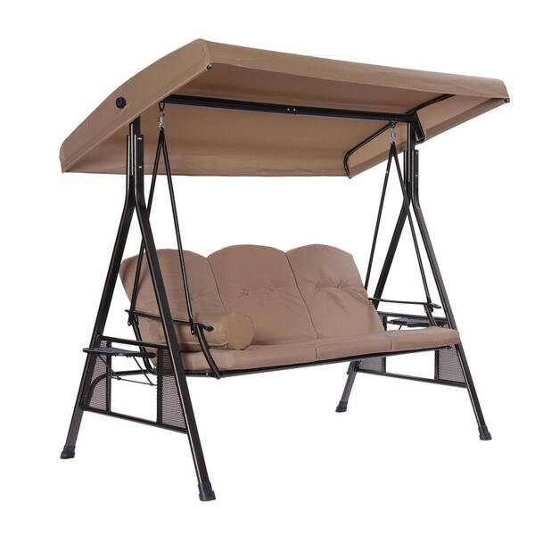79 in. W 3-Person Beige Brown Metal Luxury Porch Swing Chair With Cup Holders, Cushions, Pillows, Canopy Adjustable