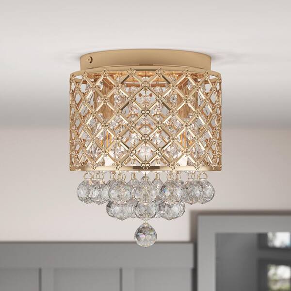 8.07 in. 2-Light Raindrop Crystal French Gold Flush Mount Mini Luxurious Ceiling Light Fixture
