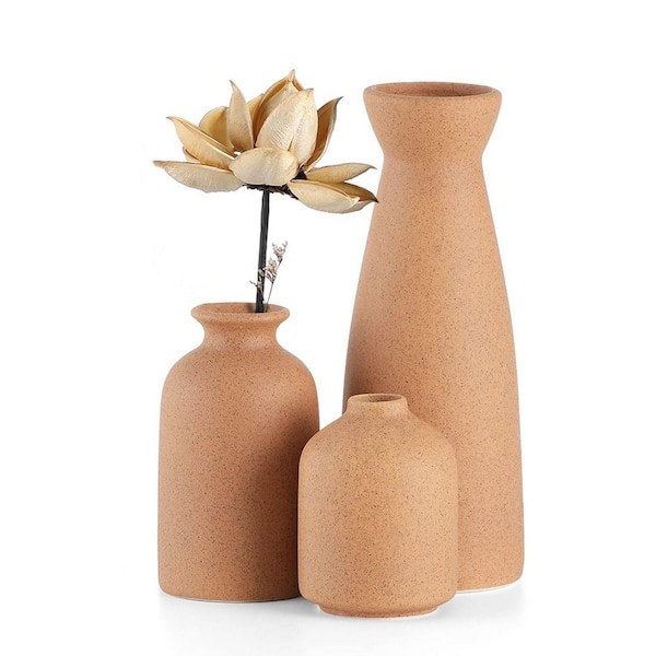 8.3 in. H Cylinder Brown Ceramic Decorative vase Set-3, Small vase for Pampas Grass and Dried Flowers