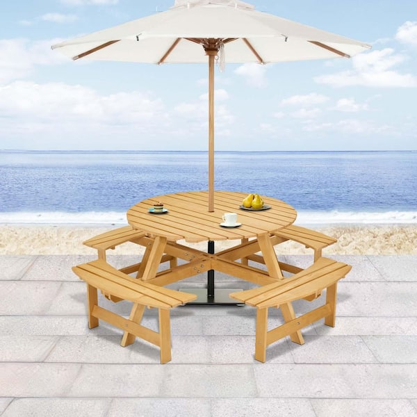 8-Person 70 in. Natural Outdoor Round Wood Picnic Table Set with 4 Built-in Benches Umbrella Hole for Backyard, Garden
