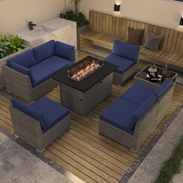 8-Piece Outdoor Wicker Patio Furniture Set with Fire Table and Coffee Table, Dark Blue
