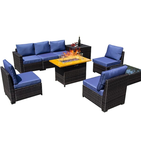 8-Piece PE Rattan Wicker Patio Conversation Set with Blue Cushions and 40 in. Firepit Table
