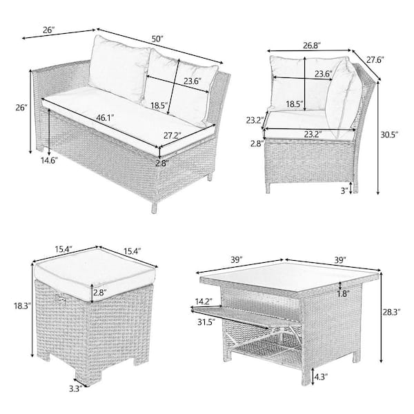 8-Piece Wicker Outdoor Dining Set with Ottoman and Beige Cushions