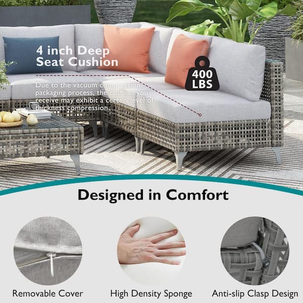 8-Piece Wicker Outdoor Patio Sectional Set with 43 in. Propane Fire Pit Table and Water Resistant Gray Thick Cushions