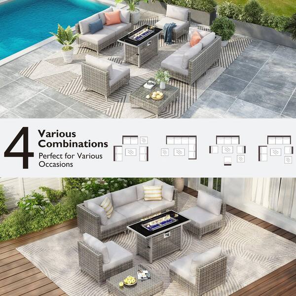 8-Piece Wicker Patio Conversation Set with Gray Cushions and 60,000 BTU 43 in. Fire Pit Table Outdoor Sectional Sofa Set