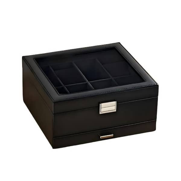 8 Slot Black Rectangular Faux Leather Cufflinks